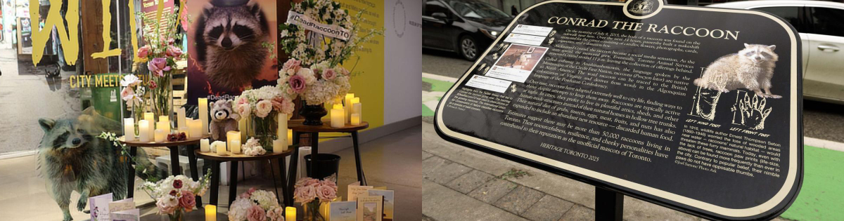 Le décès de ce raton laveur en 2015 a été l’objet d’une satire bien torontoise dans les réseaux sociaux. Au 10e anniversaire de l’événement, Heritage Toronto démontre son sens de l’humour en dévoilant une plaque commémorative officielle au nom de Conrad.